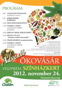 „ Közhírré tétetik, Vásár rendeztetik” - hallatszik fel ismét a jól ismert szlogen november 24-én szombaton Veszprémben, a Színházkertben. Adventi Ökovásárra hív a kisbíró mindenkit, aki egy jó hangulatú, mézeskalács illatú színes forgatagra vágyik, minőségi élelmiszereket, családi kikapcsolódást, a fára vagy a fa alá való finomságokat, kincseket keres. Nem fognak csalódni azok sem, akiket a kürtőskalács,vagy a téli forró italok vonzanak és szerencsét próbálnának a kiállítók termékeiből álló tombolán. A kiválónak ígérkező rendezvény szervezője a Csalán Környezet- és Természetvédő Egyesület, a megvalósítást a Magyar Nemzeti Vidéki Hálózat támogatja.
