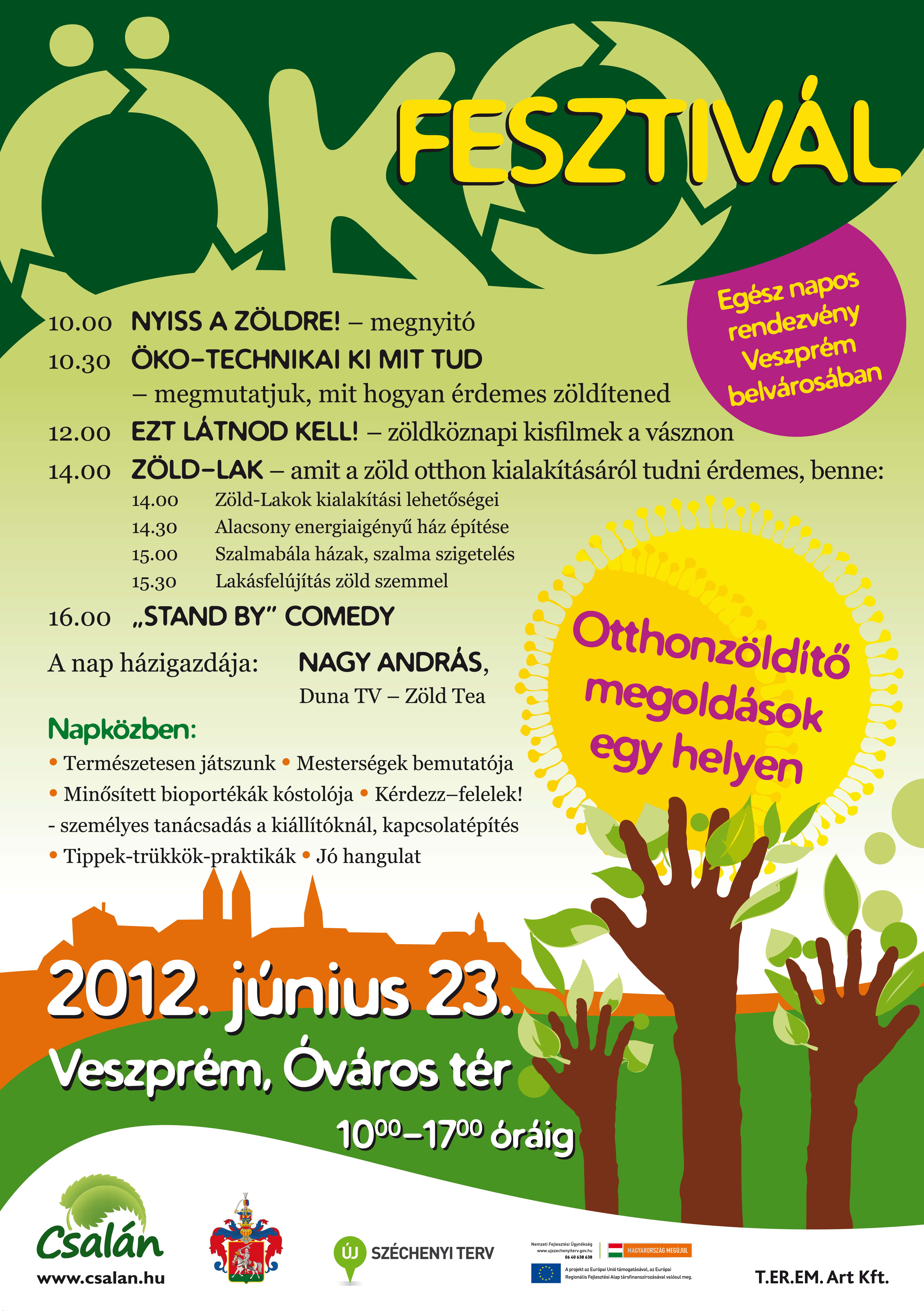 Egész napos öko-technikai forgatagra lehet számítani június 23-án Veszprém belvárosában, az Óváros téren. Helyi, környezettudatos megoldásokat bemutató cégek részvételével otthonzöldítő Ökofesztivált szervez a Csalán Környezet- és Természetvédő Egyesület, mely program Veszprém MJV Önkormányzatának együttműködésével jön létre.