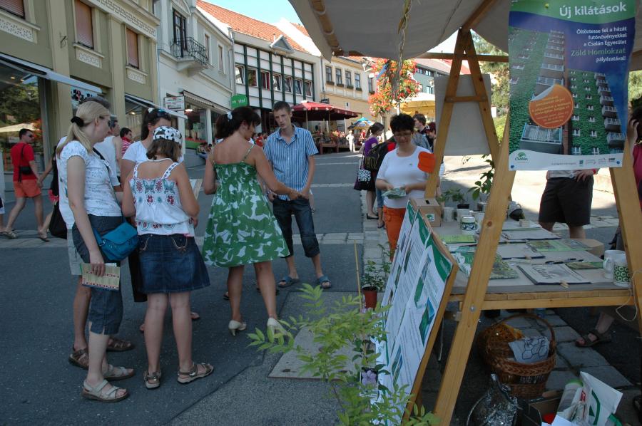 Július 16-a délutáni hőségében, hűtőtáskába rejtett sok-sok folyadék kíséretében standolt ki a Csalán Egyesület a már jól megszokott helyre, s vetette be magát ismét, hogy újabb lelkes, vállalkozó szellemű veszprémieket gyűjtsön Zöld Homlokzat programjához. Mindemellett, a lehetőség megismertetése is célja az egyesület munkatársainak, hiszen a házfalak zöld növényekkel való befuttatása a sok tévhit ellenére számtalan előnnyel járhat, és nem csak a lakótelepi lakásokban élőknek.