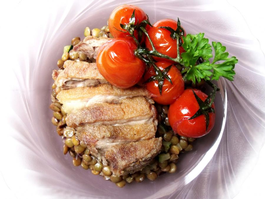 Filézett kacsacomb lencsesalátával és konfitált paradicsommal